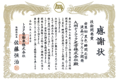 当社の開発案件、世界初「黒色瞬間応答液晶パノラマルーフ開発」としてトヨタ自動車様より「技術開発賞」を受賞いたしました。